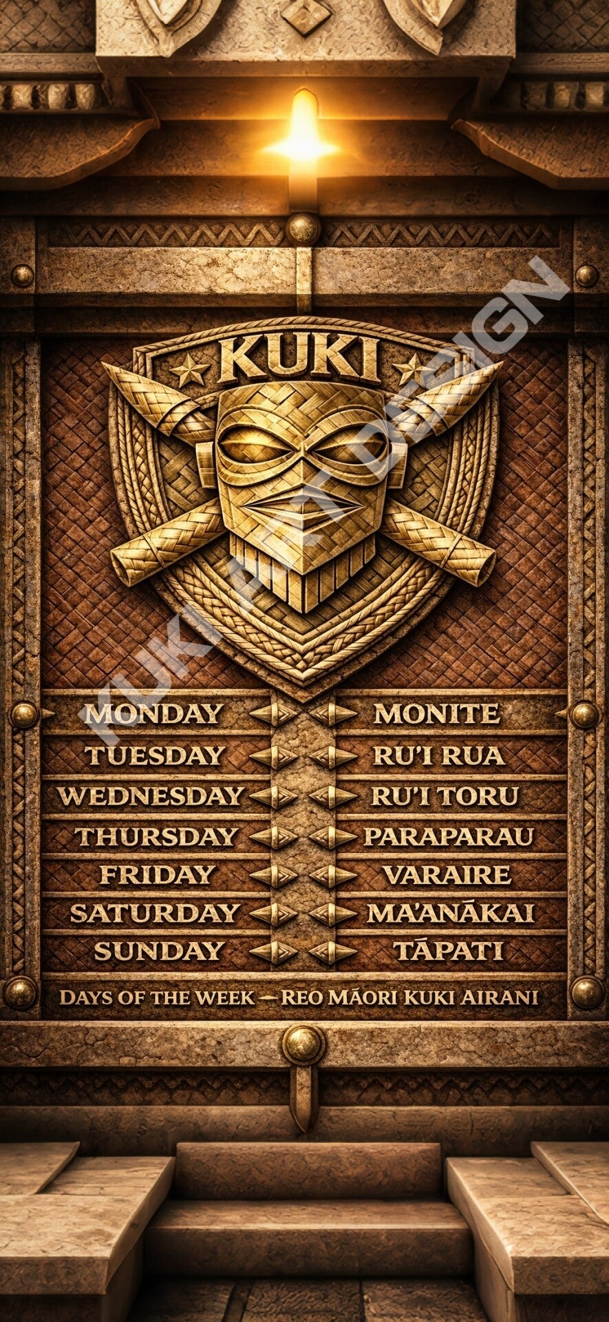 This wallpaper was created to help our younger families and children learn the days of the week in both English and Cook Islands Māori. In today’s fast-moving world, learning can happen anywhere — even on the phone screens we look at every day. By combining culture, language, and art, this design encourages our people to keep our Reo alive and make learning part of everyday life.
